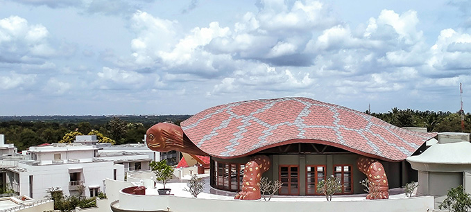 Das indische Wellness- und Naturheilkunde-Zentrum Kshemavana dient als Rückzugsort. Die Schildkröte ist ein Symbol für Yoga und Meditation. Ein massives Dach in der Form eines Schildkrötenpanzers bedeckt die Kurma Yoga Hall. Bekleidet mit VMZINC PIGMENTO rot, QUARTZ-ZINC und PIGMENTO grün überragt es das gesamte Gelände. Der Entwurf stammt von dem Architekten Mahesh Diophode und dem Designer Ayush Kasliwal vom Designstudio AKFD Studio in Jaipur. Für das einzigartige Dach benötigten die Architekten ein System, das sich gut verbinden ließ und im Endergebnis zu einem homogenen Erscheinungsbild führte. Die Antwort fand sich in individuell hergestellten Schindeln aus VMZINC. Entscheidend war hier, dass sich gerade die komplexen Formen des Daches gut mit Zink ausführen ließen. Selbst einzelne Schindeln sind noch verformbar, so dass sich der Panzer von Kurma gut modellieren ließ. Viel Spaß beim Weiterlesen in unserem aktuellen Blogeintrag!