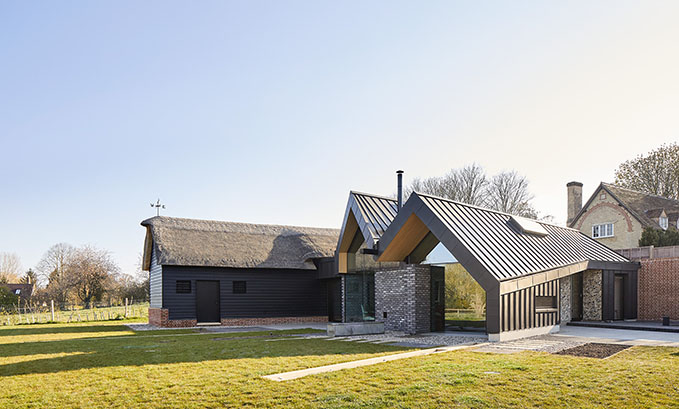 Das Projekt "Gables" wurde von CDC Studio entworfen und ist ein Altersruhesitz für ein pensioniertes Ehepaar in Bartlow, südwestlich von Cambridge, England. Integration alter und neuer Elemente: Das Architekturbüro integrierte eine alte Scheune in das neue Gebäude, wobei die Scheune originalgetreu wieder aufgebaut und mit einem Reetdach versehen wurde. Architektonisches Design: Das Gebäude besteht aus einer Kombination aus traditionellen und modernen Elementen. Die Giebelseiten sind vollständig verglast und bieten einen Blick auf die Landschaft. Materialien und Ästhetik: Die äußeren Materialien, wie dunkles, vorbewittertes ANTHRA-ZINC und dunkles Holz, wurden passend zur ländlichen Umgebung gewählt. Innenräume sind mit hellem Weißtannenholz gestaltet. Energieeffizienz: Das Gebäude verfügt über eine Luftwärmepumpe und eine Photovoltaikanlage, um den Energieverbrauch zu minimieren. Handwerkliche Qualität: Trotz der Komplexität des Designs wurde das Gebäude handwerklich hochwertig umgesetzt. Harmonische Integration: CDC Studio ist es gelungen, die verschiedenen Anforderungen der Bauherren, die wieder aufgebaute Scheune und die bestehenden Sichtlinien auf eine stimmige Weise in Einklang zu bringen. Mehr dazu in unserem aktuellen Blogeintrag!
