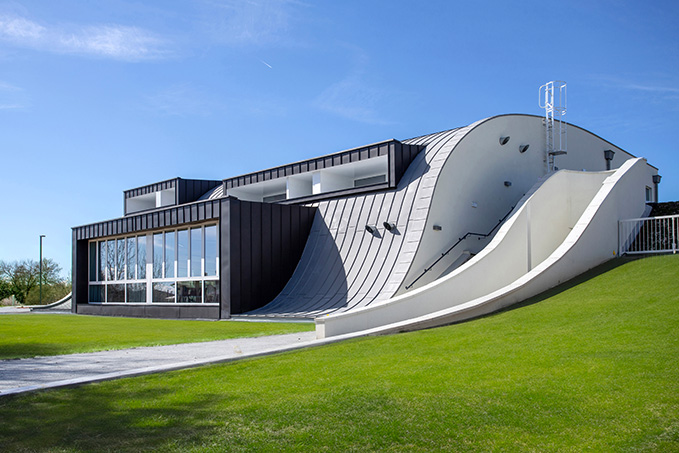 Federico Bargone, der leitende Architekt des Architekturbüro S. B. Arch. Bargone Architetti Associati, betont die starke Verbindung zwischen dem Park und der Bibliothek, die durch große Fensterflächen und das geschwungene Design betont wird. Dies schafft ein kraftvolles Element der Stadterneuerung. Die Bibliothek öffnet sich zur Umgebung durch große Fensterflächen. Auf der Parkseite ragen Fenstergauben aus dem Zinkdach hervor und setzen optische Akzente. Der Farbkontrast zwischen den hellen und dunklen Zinkbereichen wird durch eine verzahnte Verlegung aufgefangen. Das Dach der Bibliothek besteht aus QUARTZ-ZINC mit Flachdachgauben in ANTHRA-ZINC, die starke optische Akzente setzen. Diese Gauben treten unterschiedlich groß aus dem wellenförmigen Dach hervor und schaffen Kontraste. Das Zinkdach wurde wegen seiner ästhetischen Qualitäten und Formbarkeit gewählt. Das Material ist langlebig und recycelbar, was zur Integration in die natürliche Umgebung beiträgt. Die Bibliothek nutzt nachhaltige Technologien wie Photovoltaikmodule und Regenwasser-Rückgewinnungssysteme. Die Natalia-Ginzburg-Bibliothek im Norden Bolognas, mit ihrem geschwungenen Dach und der Integration in den Park, ist ein markanter Anziehungspunkt in Castel Maggiore geworden. Das Zusammenspiel von hellen und dunklen Zinkbereichen und die angrenzende Rasenfläche runden das Gesamtbild ab. Mehr dazu in unserem aktuellen Blogeintrag!