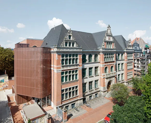 Zinkverkleidungen bieten für Treppenhäuser zahlreiche Vorteile, insbesondere in Kombination mit architektonisch anspruchsvollen Gebäuden. Ein Beispiel dafür ist das Treppenhaus einer Schule in Hannover-Linden, bei dem Zink als Materialwahl überzeugt. Die Verwendung von perforiertem VMZINC in der Farbe PIGMENTO rot schafft eine harmonische Verbindung zum roten Klinkermauerwerk des historischen Schulgebäudes. Diese Zinkverkleidung trägt zur modernen, aber respektvollen Erweiterung bei und ergänzt das Altbauensemble. Die Perforation der Zinkbleche, mit einem Lochanteil von 50 %, ist nicht nur ästhetisch, sondern erfüllt auch statische Anforderungen. Die rechteckige Stanzung der Bleche nimmt das Fugenbild des Mauerwerks auf und sorgt für eine visuelle Verbindung zwischen Alt und Neu. Außerdem verleiht die zweiseitige Aufkantung den Zinkblechen zusätzliche Steifigkeit und Struktur, was der Fassade Dynamik verleiht, die je nach Lichteinfall variiert. Ein weiterer Vorteil von Zink als Material ist seine Flexibilität. Der Aufzugsschacht neben dem Treppenhaus wurde ebenfalls mit Zink verkleidet, allerdings ohne Perforation und in Winkelstehfalztechnik, um eine feinere, unauffälligere Erscheinung zu erzielen. Zink ist nicht nur robust und pflegeleicht, sondern bietet auch ästhetische Vorteile: Tagsüber wirkt das Gebäude durch die Zinkverkleidung geschlossen, während es nachts durch die Innenbeleuchtung des Treppenhauses in einem anderen Licht erscheint. Die Zinkhülle wird dann filigraner und lässt das historische Gebäude wieder stärker in den Vordergrund treten. Mehr dazu in unserem aktuellen Blogeintrag!