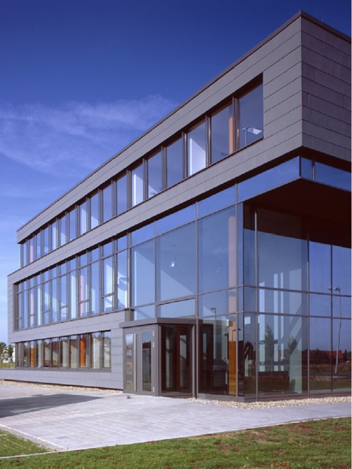 Pour ce bâtiment de trois étages, les architectes ont choisi un concept créant l’impression de barres superposées, marquées par l’interaction du verre et du métal. Ici, le bardage en zinc confère sa structure au bâtiment, tandis que le verre reflète les changements de temps et la lumière incidente. Le QUARTZ-ZINC® posé en profils agrafés délimite les différents étages. Les niveaux semblent légèrement décalés les uns par rapport aux autres. Aux extrémités du bâtiment, verre et zinc alternent sur toute la largeur pour donner l’effet d’un ruban sinueux qui s’élève du sol vers le ciel.