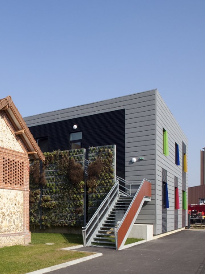 Philippe Lachapelle, l’architecte, a joué sur les contrastes entre les deux bâtiments, chacun ayant un caractère fort. La sobriété et la modernité du zinc lui ont permis de créer cette variation, cette rupture entre les espaces. L’édifice ancien affirme son caractère patrimonial et le bâtiment neuf, son identité contemporaine, accentuée par ses façades végétalisées dont la verdure vient adoucir l’ensemble et compléter la palette de couleurs.