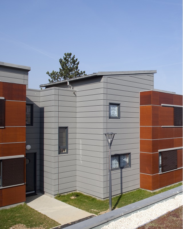 Pour réussir cette intégration, l’architecte a repris les thématiques développées pour le lycée et fait le choix de matériaux similaires : bois et bardage zinc en façade et zinc à joints debout pour la ouverture. Sur le plan de la conception, l’architecte avait une idée très claire de ce qu’il voulait : «Nous avons travaillé les volumes et les découpes afin que les logements soient perçus comme des maisons individuelles, sans toutefois en avoir tous les attributs, de manière à préserver l’intimité des occupants. La différenciation des matériaux de façade, bois et zinc, ainsi que le jeu sur les volumétries y ont fortement contribué ».