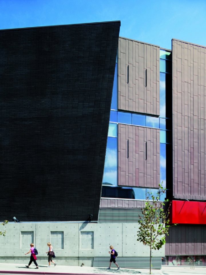 la collision, un chaos maîtrisé, où s’entrechoquent des pans de murs trapézoïdaux habillés de zinc avec de grandes baies vitrées et des ombrières métalliques. Entre les deux ailes