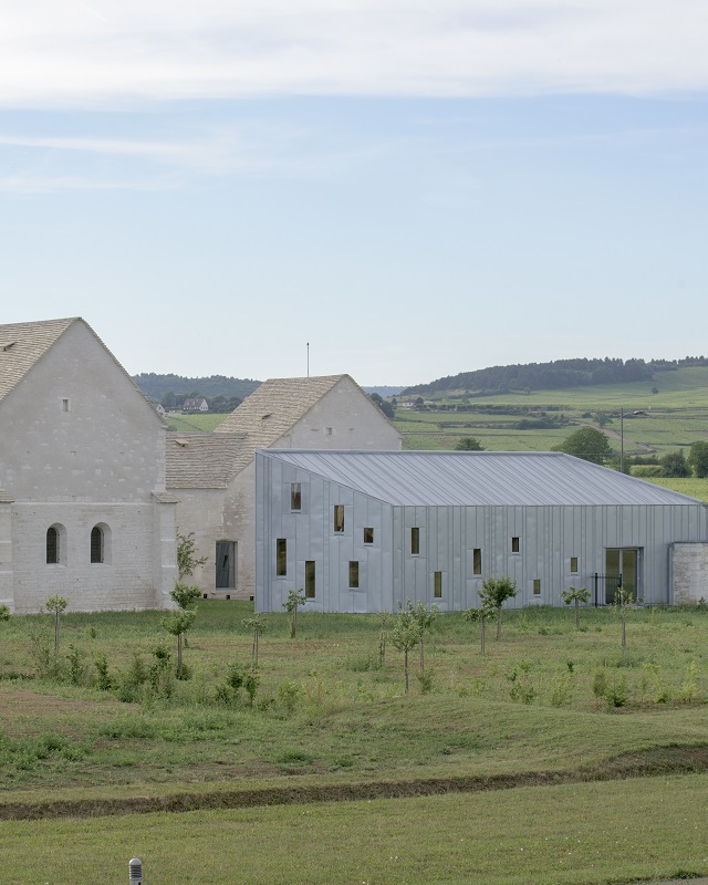 Jung Architectures souhaitait préserver la minéralité du monument. Il envisageait d’utiliser en toiture et façade le calcaire de Bourgogne, un matériau local présent sur le bâtiment existant. « Pour des problèmes d’avis technique, nous avons dû renoncer à la pierre et nous nous sommes mis en quête d’une matière minérale alternative. La matité, la luminosité de la matière, la texture du zinc AZENGAR®, nous ont semblé pouvoir établir une relation très intéressante avec le calcaire en strate de la léproserie. », explique Frédéric Jung. Le dialogue avec l’existant s’est poursuivi dans la mise en oeuvre du matériau. Appliqué en toiture et en façade, le zinc forme une nappe de métal ui s’émancipe pour devenir abstraite. Les percements aléatoires de l’extension trouvent écho dans les fenêtres d’origine, qui ont vu leur régularité altérée au fil des siècles par des interventions successives.