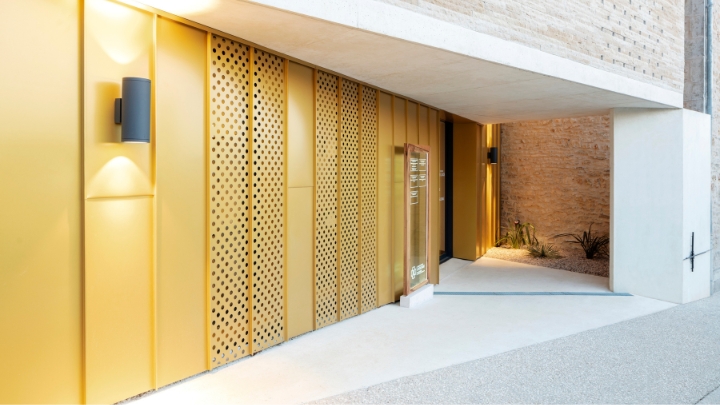 Implantée dans le contexte urbain du centre historique de Gramat (46), sur une rue présentant une forte déclivité, l’extension de la clinique dentaire Costecaude relie le bâtiment principal de la clinique à un autre bâtiment de type pavillonnaire situé en amont de la rue. Cette nouvelle construction, élevée sur 3 niveaux, a permis de repenser l’entièreté de l’espace de soins de manière fonctionnelle et esthétique. Conçue comme le pont entre ces deux édifices, la façade est pensée comme un subtil dialogue « d’or et de pierre », et associe le zinc laqué OR 691 VMZINC à la pierre de Bourgogne. Posé à joint debout et perforé pour évoquer le motif d’un moucharabieh.