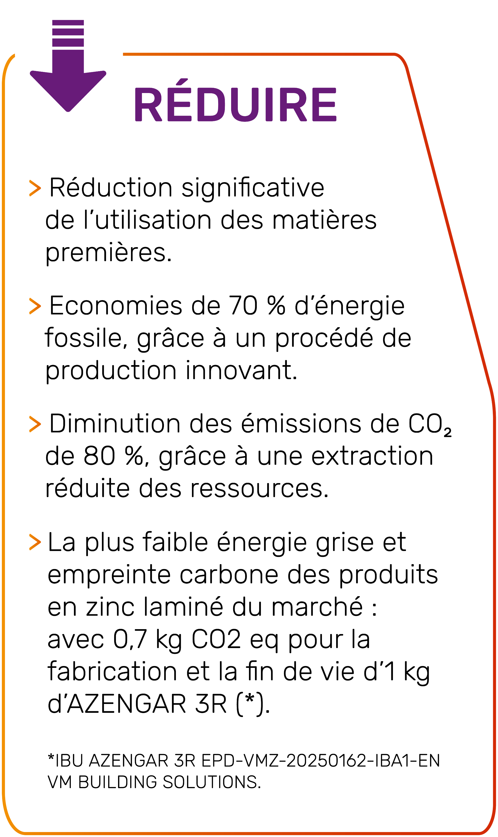 Nous croyons en la seconde vie des matériaux et en l’impact de chaque geste pour bâtir un avenir plus durable. C’est dans cette démarche que s’inscrit AZENGAR 3R, notre zinc 100 % recyclé, pensé selon les principes de l’économie circulaire : Réduire, Réutiliser, Recycler.