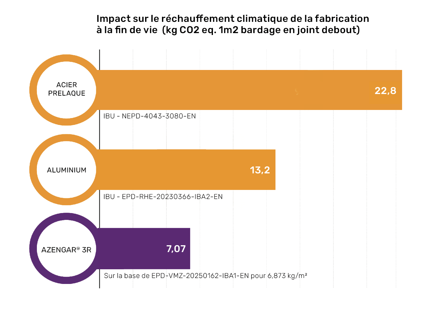 Avec une empreinte carbone de seulement 0,70 kg de CO2 par kg de zinc (correspond à 7,07 kg CO2 eq. 1 m2), AZENGAR 3R établit une nouvelle norme dans l'industrie.