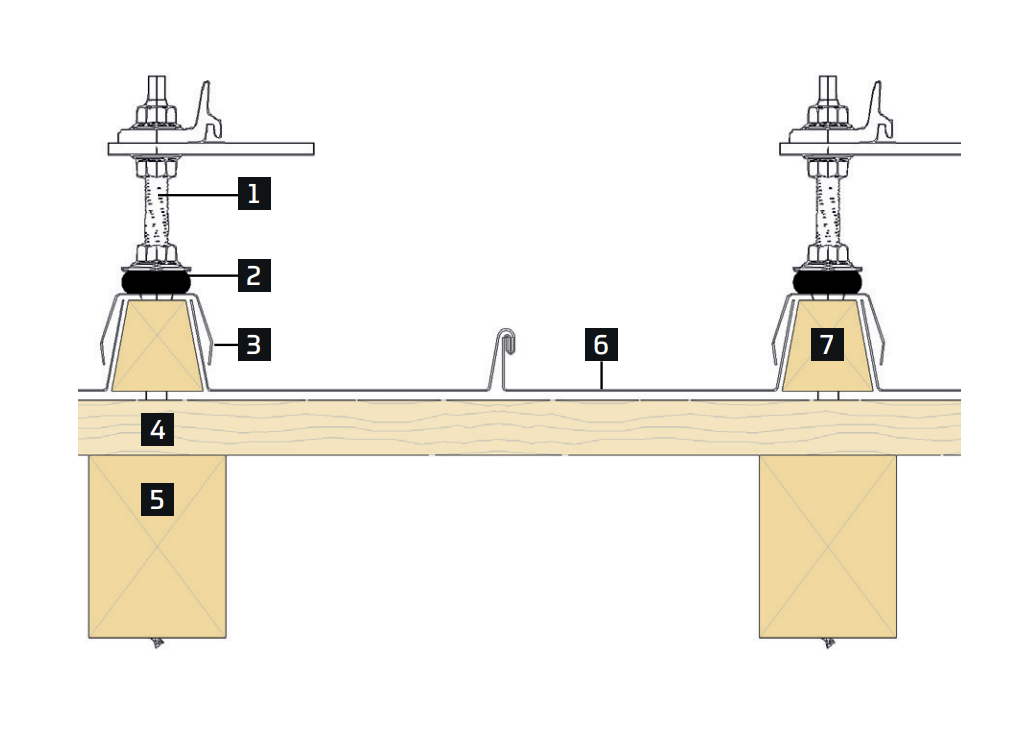 - Les caractéristiques des vis (quantité et diamètre, taille du pré-perçage, profondeur de l’ancrage) sont de la responsabilité de l’entreprise ou du bureau d’études associé au projet et sont définies en fonction de la charge des panneaux solaires.