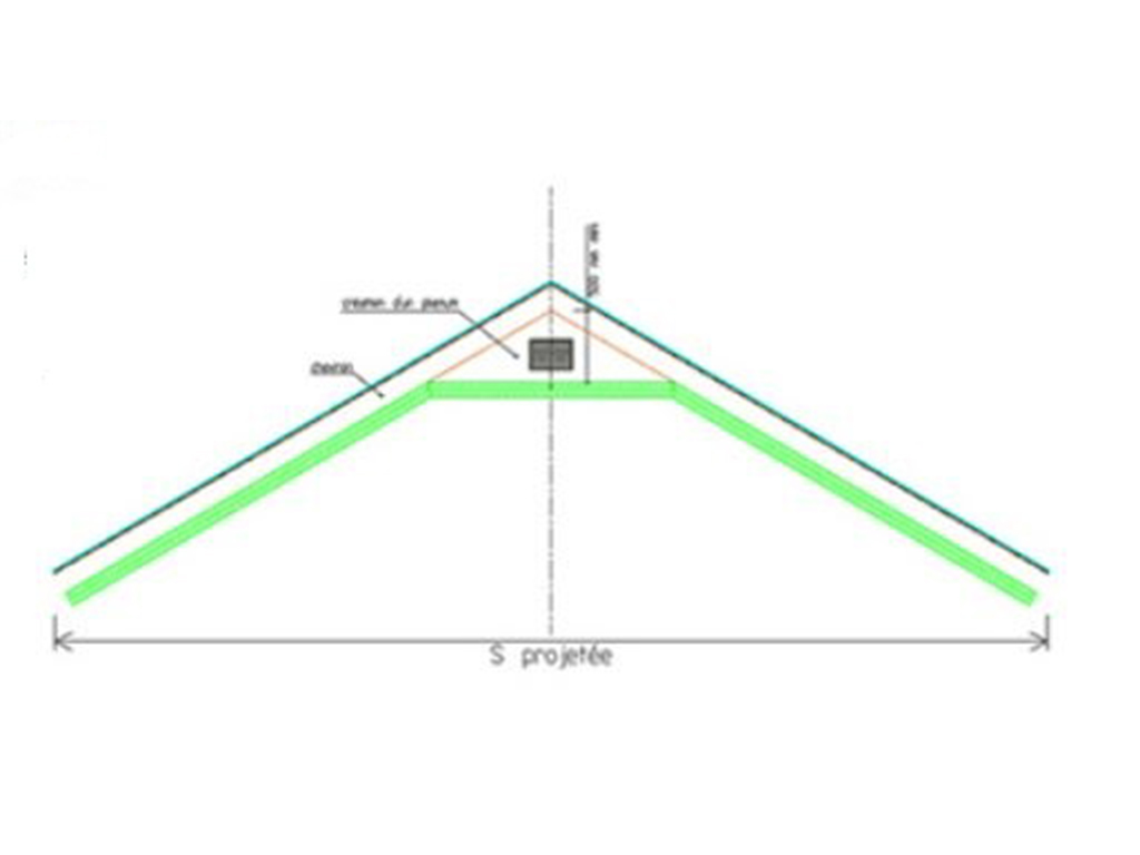 Cette solution est possible lorsque la distance entre les rives est inférieure à 12,00m, et si une circulation d'air est assurée entre les travées et les chevrons. Dans le cas de sorties de ventilation par grilles, il est impératif de créer un plénum de 50 cm minimum au faîtage.