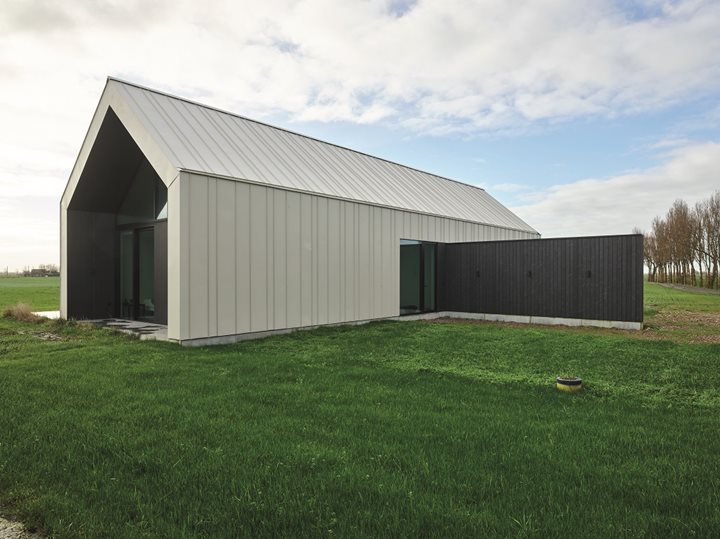 Het woonhuis van Stefan’s Goat Farm maakt deel uit van de ouderlijke woonst van Stefan. Als bouwheer hadden Annie en Stefan de uitgesproken wens om een volledig witte woning te realiseren. De keuze viel voor zowel het dak als de gevel op gelakt wit zink met staande naad in wisselende baanbreedtes, goed voor een oppervlakte van in totaal 440 m². “We zijn bewust voor hetzelfde materiaal op dak en gevel gegaan”, zegt Pieter Popeye. “Op die manier ontstond het concept van een witte schil met contrasterende vlakken dankzij het schrijnwerk. De combinatie van het zijdelings licht op het dak en de verschillende lengtes zorgt voor een leuk spanningsveld.”