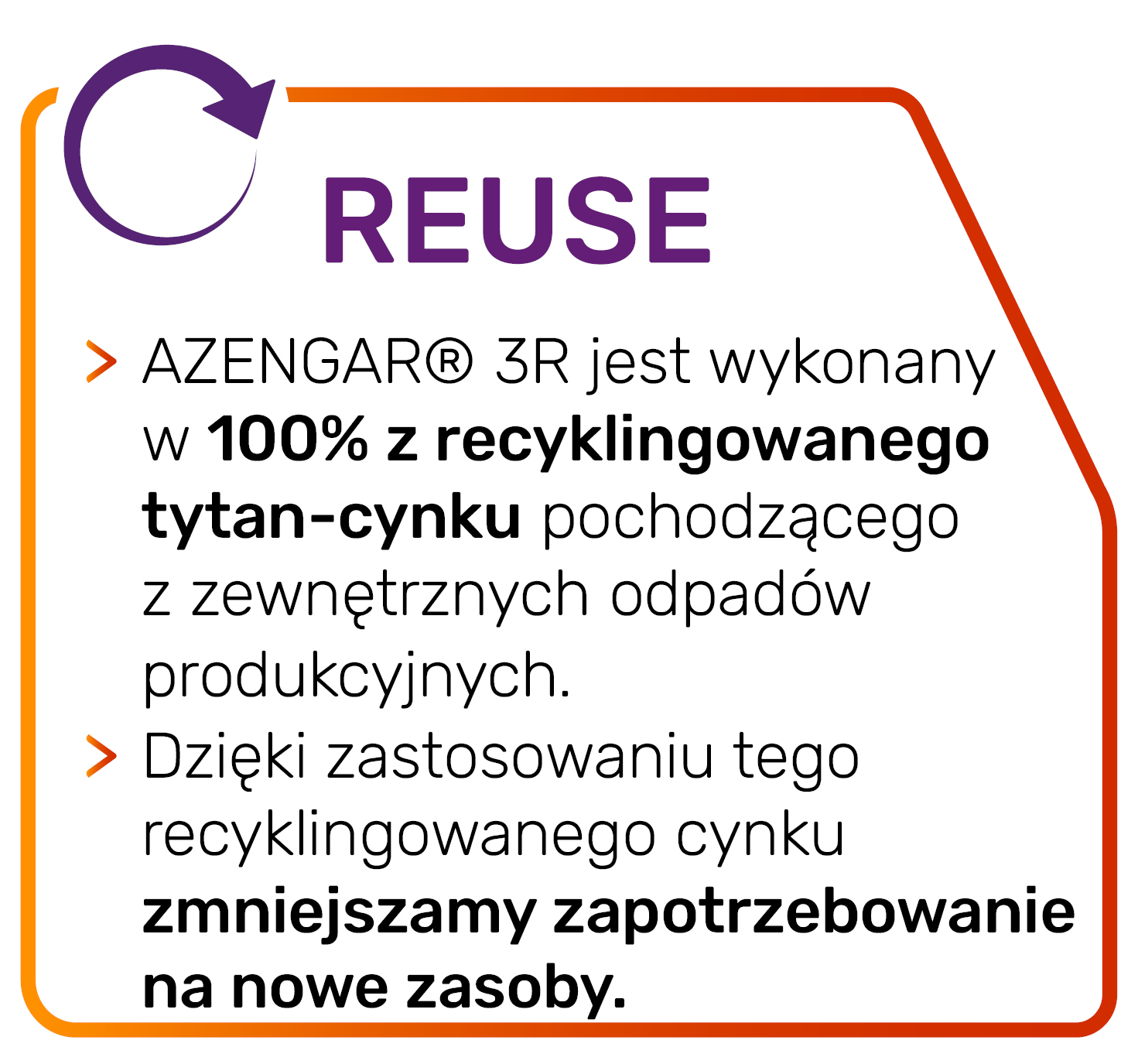 - AZENGAR® 3R jest wykonany w 100% z recyklingowanego tytan-cynku pochodzącego z zewnętrznych odpadów produkcyjnych.