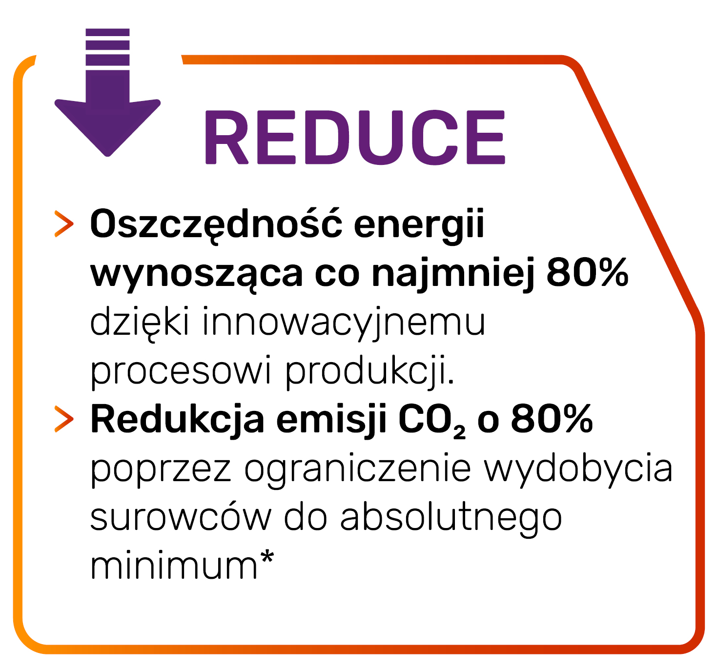 - Oszczędność energii wynosząca co najmniej 80% dzięki innowacyjnemu procesowi produkcji.