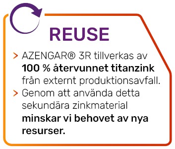 AZENGAR® 3R är tillverkat av 100 % återvunnet titanzink, som produceras av externt produktionsavfall – zink som annars skulle skrotats. Istället behåller vi dess fulla värde och ger det nytt liv i en produkt som uppfyller samma höga tekniska standarder som nyproducerat zink. Genom att använda detta sekundära zinkmaterial minskar vi behovet av nya resurser och förlänger materialets livscykel.